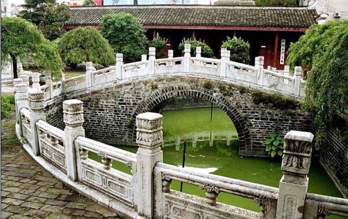 向前十步臨半月形泮池,池上有磚石拱橋,池橋皆以漢白玉石雕欄桿護(hù)配。池中碧水漾漾,金鯉嬉戲,甚是賞心悅目。傳聞明清季桐城如“天啟六君子”之一的左光斗、“百科全書式”大哲學(xué)家方以智、“父子雙宰相”張英、張廷玉以 “桐城派”鼻祖戴名世、方苞、劉大魁、姚鼐等到近千們名臣碩儒,于成名前均從橋上步入大成殿祭孔,以到金榜題名,幫譽(yù)“泮橋”為“狀元橋”,迄今人們?nèi)砸暤撬箻驗(yàn)榧槿缫庵畼肥隆?/p>