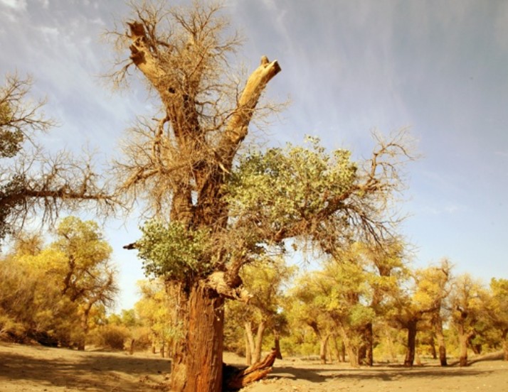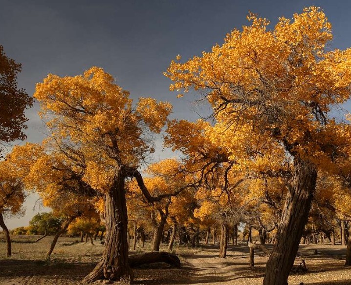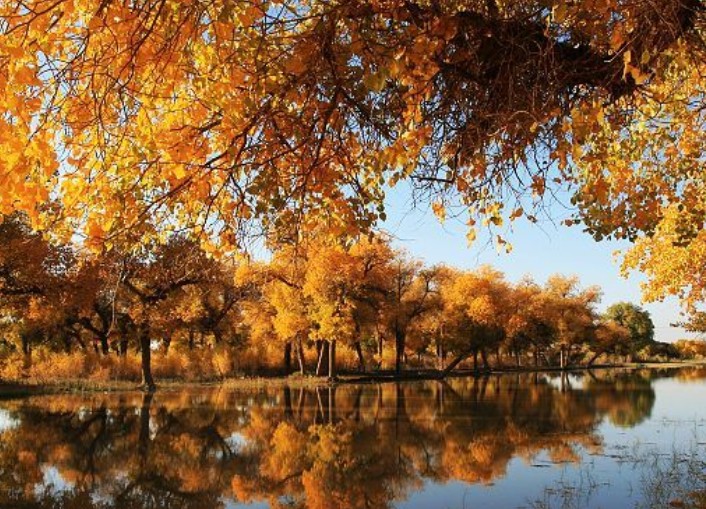 內(nèi)蒙古阿拉善盟的額濟(jì)納旗,現(xiàn)有天然胡楊林45萬畝,是世界僅存的三大胡楊林之一,是國(guó)家自然保護(hù)區(qū)和國(guó)家森林公園。胡楊林是一個(gè)古老的樹種,被譽(yù)為“植物活化石”,有“生一千年不死,死一千年不倒,倒一千年不朽”的美譽(yù)。胡楊,又名“梧桐”,為古地中海殘遺物種,屬落葉喬木,蒙古語稱為“陶來”。胡楊木質(zhì)纖細(xì)柔軟,樹葉闊大清香,耐旱,生命力頑強(qiáng),是自然界稀有的樹種之一。金秋十月,額濟(jì)納是一個(gè)童話般的世界。胡楊金葉掛滿枝頭,細(xì)細(xì)看來,在樹枝間竟尋不到一片異色葉子,密密匝匝,金光燦爛,至純至美;遠(yuǎn)遠(yuǎn)望去,一片片金色的胡楊把大漠裝點(diǎn)得如詩(shī)如畫,匯集成金色的海洋,吸引著大批國(guó)內(nèi)外賓客到此旅游、采風(fēng)、攝影。