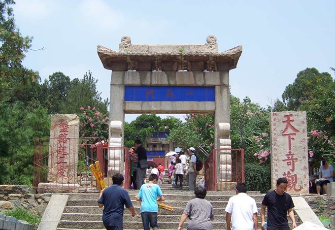 宮前三重石坊形若階梯。前為一天門坊,明代建,參政龍光題額,清康熙五十六年(1717年)巡撫李樹德重建,兩側(cè)有明代人題“天下奇觀”及“盤路起工處”大字碑。中有孔子登臨處坊,明嘉靖三十九年(1560年)巡撫山東都察院右副都御史朱衡等建,嘉靖狀元羅洪先題額并聯(lián):“秦王獨步傳千古,圣主遙臨慶萬年。”聯(lián)語于1967年被鑿毀。