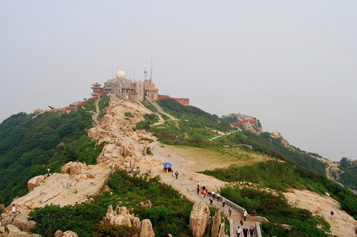 峰頂舊有迎旭亭,民國(guó)年間建泰山氣象站。1984年在東側(cè)依崖而筑觀日長(zhǎng)廊,全長(zhǎng)30米,亭廊銜接,似仙閣矗立,鮮艷奪目。