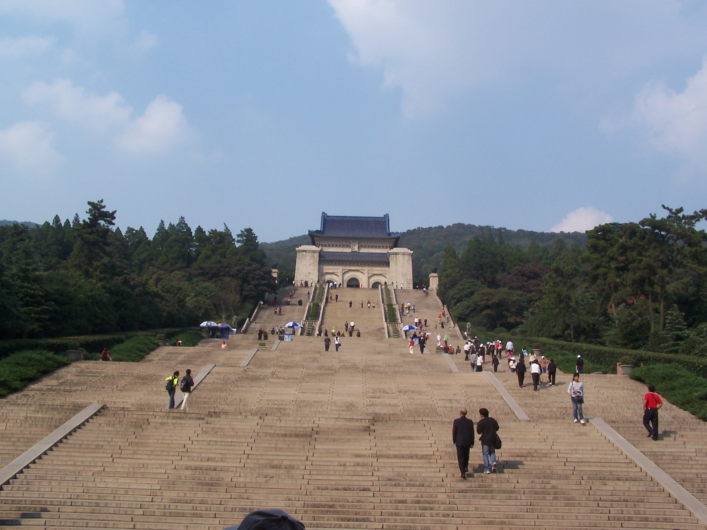 從牌坊到祭堂,共有石階392級,8個平臺,落差73米。392級石階象征當時中華民國人口3億9千200萬。陵墓入口處有高大的花崗石三門牌坊,上有中山先生手書的“博愛”兩個金字。石坊后是長達375米、寬40米的墓道。前行為陵門,它以青色的琉璃瓦為頂,門額上為孫中山的手跡“天下為公”四個大字。
