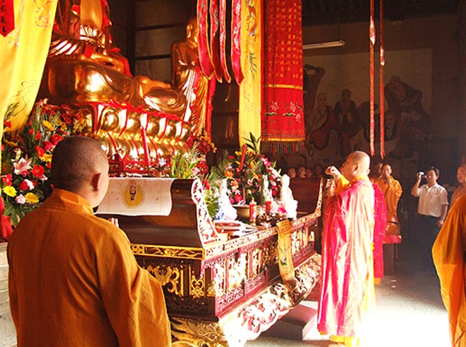 大雄寶殿是法華院的主體建筑,它依山面南而座,殿內供奉佛祖釋迦牟尼,因他大智大勇,無敵于邪惡,故人們尊稱其為“大雄”。“大雄寶殿”四個大字為原全國佛教協會會長趙樸初先生所題。立于佛祖兩旁分別是他的兩個弟子大迦葉和阿難尊者 。大殿東、西、北三面墻壁繪有文殊菩薩、普賢菩薩和十八羅漢,壁畫描繪的生動、精美。