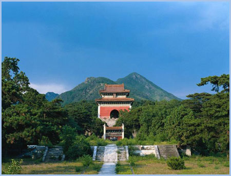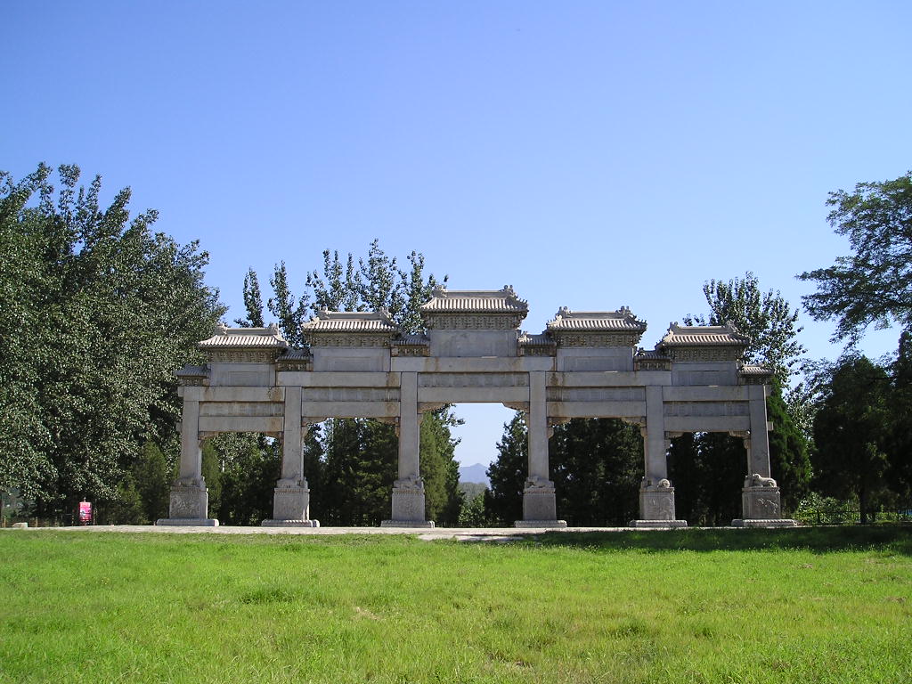 大紅門 坐落于陵區(qū)的正南面,門分三洞,又名大宮門,為陵園的正門。大門兩旁原各豎一通石碑,上刻"官員人等至此下馬"字樣。凡是前來祭陵的人,都必須從此步入陵園,以顯示皇陵的無上尊嚴。大門兩側(cè)原設(shè)有兩個角門,并連接著長達80華里的紅色圍墻。在蜿蜒連綿的圍墻中,另設(shè)有一座小紅門和十個出入口,均派有重兵駐守,是百姓不可接近的禁地?,F(xiàn)在這些圍墻都早已坍塌,有些殘跡尚依稀可辨。