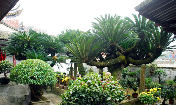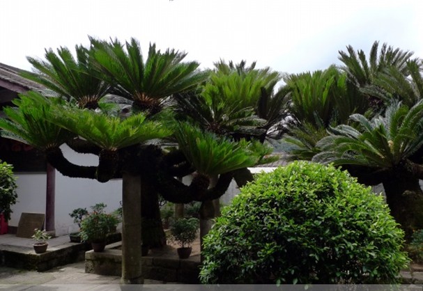 在方丈室的庭院內(nèi)種有三析鐵樹,相傳有兩株樹齡已超過一千年,其中一株為閩王王審知所種,一株是開山祖神宴法蚰所植。版權(quán)所有山東聊城聊之旅國際旅行社有限公司,轉(zhuǎn)載必究!1929年虛云老和尚應(yīng)當時福建省主席楊幼京之請,回鼓山涌泉寺任住持,講經(jīng)傳戒、整頓寺規(guī)、創(chuàng)辦戒律學(xué)院,恢復(fù)禪堂規(guī)制,修建頹廢殿宇,整頓經(jīng)版文物,勛勞卓著。1930年,他為僧眾講《梵網(wǎng)經(jīng)》,恰逢兩株千年的鳳尾鐵樹開花,遠近來觀乾,絡(luò)繹于道。當時,聘任羯摩師文質(zhì)和尚撰小文記之:“庚午春(1930)值虛云兄主持石鼓,傳授戒法,余以隨喜之余,航海赴閩,參予盛典。既至。則鐵樹開花,繁茂無比,花大如盆,須瓣若鳳尾,咸以優(yōu)曇相慶。詢之耆日,皆言叟物也,其一為閩王手植,一為圣國師手植,迄今千載,敷此妙華,實為希有。邀虛兄攝影留證,用志涌泉寺瑞應(yīng)焉。”是年虛云和尚已九十一歲了,方丈室鐵樹三株,兩雌一雄,雄花似小狐尾,雌花如黃絨球,真是奇觀,近期年年開花,游人可飽眼福。