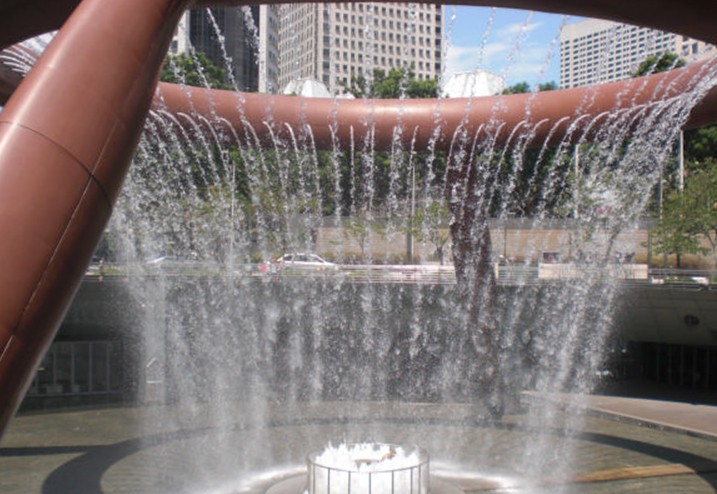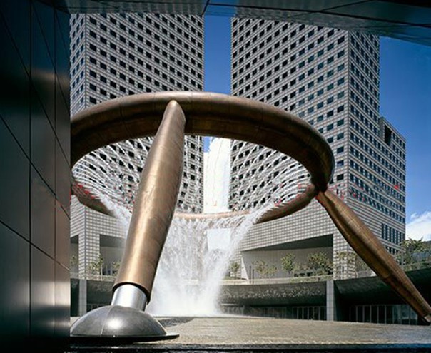 財富噴泉是由四根傾斜的青銅巨柱組成,柱頂是一個直徑66米的青銅圓環(huán),整個結(jié)構(gòu)垂直高度13.8米。整個噴泉占地1683.07平方米,噴出的水柱可達30米。