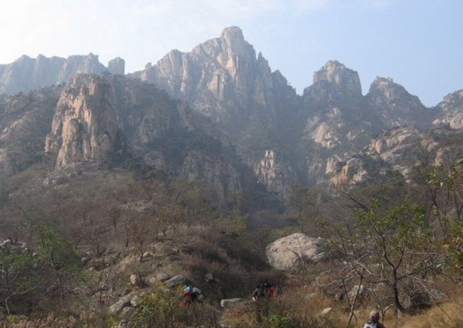 蓬萊崮山雙峰并起,高入云端,南崮海拔510米,山巔有龍興寺,尚存金代刻石多處。北崮海拔542米,有兩條登山通道,其一順巨石巖隙,蜿蜒而上,路窄坡陡,俗稱“梯子口”;其二為人工開鑿的盤石路,路一側(cè)直臨崖頭,極其險(xiǎn)峻。山巔平坦,有插旗頂、飲馬灣、西校場、龍墩、繡墩等景點(diǎn)和古代屯兵足跡。