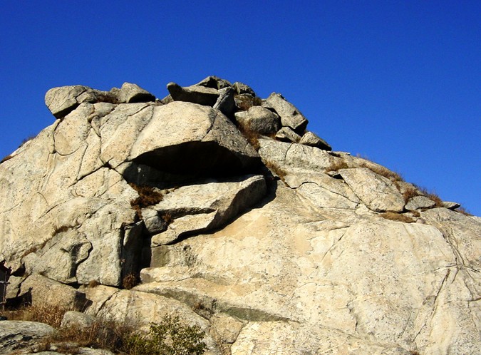韓信點(diǎn)將臺:位于崮山頂峰北部,面向山谷,臺面平整如刀削,鄰近懸崖之處,一道石壁突兀而起,臺下是懸崖峭壁,右側(cè)有數(shù)級臺階,也是天然形成。
