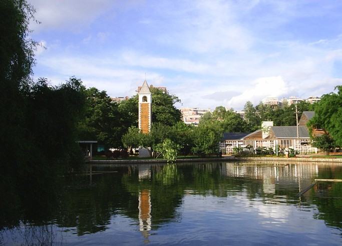 位于玉溪市州城西北10公里奇黎山下的九龍池,又名奇黎溪, 是當(dāng)?shù)刂募丫皠俚刂弧?據(jù)《重修九龍池碑記》載, 寺廟初創(chuàng)于清朝之前, 幾經(jīng)擴(kuò)建,到公元1729年(雍正七年),又“新作石橋,長虹臥波,幾于騰空直上。繼修大寺閣,燃然一新,儼若普陀”??梢?, 200多年前,九龍池廟宇已頗具規(guī)模。 九龍池風(fēng)光,最吸引人的地方,首先是那潭十分清澈明凈的池水。乾隆《新興州志》描寫其水,從“巖石間潺潺流出,聚為一泓,清可鑒發(fā)”。不論春夏秋冬,無數(shù)游魚,搖尾相戲。晴日,池旁斑駁的樹影清晰如畫地印在池中;微風(fēng)吹來,則漣漪輕蕩,樹影碎散,魚群晃動,別有佳趣。有池子四周,設(shè)有欄桿。 池上,一橋飛跨正中,橋洞門頭上,刻有“九龍池”三字。龍?zhí)兜某鏊浚缺镜仄渌?,都要大得多,歷來是灌溉玉溪壩子“四十二屯”萬畝良田的重要水源之一。故前人有詩吟道:“山滿青光水滿池,滔滔利澤本無私。未知百里臨民侯,可似九龍作雨時。”九龍池的山巖峭壁聳峙, 層巒疊嶂。 沿著池畔臺階拾級而上,在險峻的林壑之巔,建有樓臺亭閣,雕梁畫棟,金碧輝煌。大觀樓、聽泉樓、三圣閣、大士閣、文星閣等,均有詩詞對聯(lián)可以觀賞。“欲窮千里目,更上一層樓”。文星閣位置最高,巍峨矗立,直插云霄。只要登樓遠(yuǎn)眺,眾山皆小,翡翠般的玉溪壩子,可盡收眼底。遠(yuǎn)處山川,連綿不絕,此起彼伏; 星羅棋布的村舍,縷縷炊煙,裊裊升起;縱橫交錯的林蔭大道,車水馬龍,往返不息。視近處,龍池周圍,古木參天,郁郁蔥蔥,鳥語花香,林濤陣陣。池子?xùn)|邊的平場上,有古戲臺一座,至今尚存。歷史上,每年春節(jié)在此大鬧花燈是個傳統(tǒng)。四面八方來游玩的人,真是人山人海。 除池、 亭、 山、水之外,九龍池還有上中下松園,三園相近。園內(nèi)的云南巨松,拔地而起,蒼勁挺拔,高達(dá)十?dāng)?shù)丈,相傳為明代寺內(nèi)老僧所值。座落在龍池下面的飛井海(水庫),水面寬闊,碧波如玉。西岸的農(nóng)村,坡坡桃林,處處綠蔭。山道彎彎,阡陌相連。當(dāng)盛產(chǎn)飛井桃,其味甜美,遠(yuǎn)近聞名。近年來,當(dāng)?shù)厝嗣裾畵芸钸M(jìn)行修復(fù),建立了專門管理林園機(jī)構(gòu),使古老的九龍池恢復(fù)了青春。