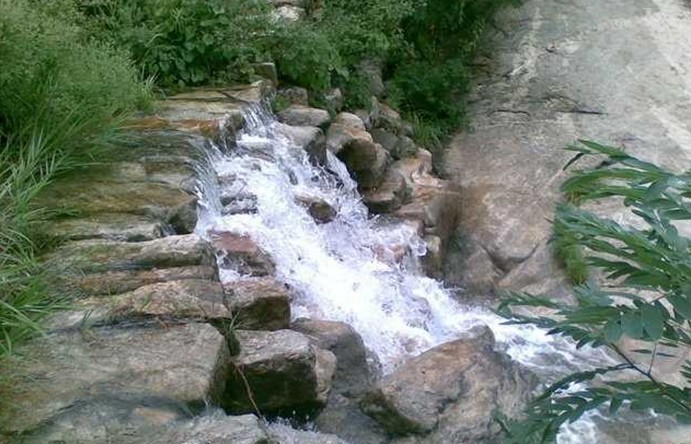一股清泉從石縫涌出,涌上突兀的巖石,沿巨石涌入水潭。涓涓細(xì)流,或聚或散,有時(shí)如一片珠簾,隨風(fēng)飄灑,水簾在陽光映射下,時(shí)明時(shí)暗,耀著彩虹,下有一水潭,水面達(dá)2000平方米,山翠水清,石奇潭垂,一年四季皆有美景。