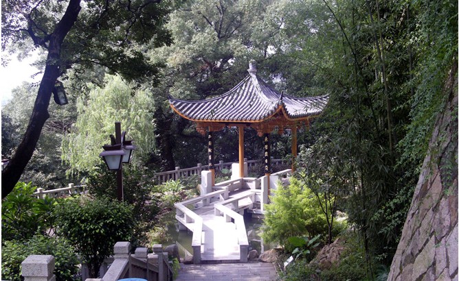 從山的東南麓烏山路拾級(jí)登山,行數(shù)十步,就到天香臺(tái)。向西折,為沖天臺(tái),是36奇景之一。在后壁鐫刻楷書"古放鶴亭"4字。臺(tái)旁還有宋程師孟的篆書石刻"沖天臺(tái)"3字。"沖天臺(tái)"畔有兩方夾峙的大巖石,巖頂橫著一塊天然條巖,這就是"天臺(tái)橋"。此橋奇險(xiǎn),據(jù)說只有"肯舍身"的人,才能登得上去。