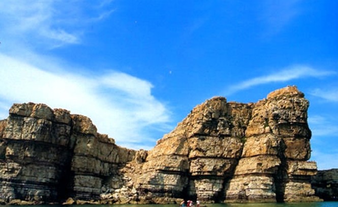 九丈崖位于北長(zhǎng)山島的西 北角,西依珍珠門水道,北鄰國(guó)際航線長(zhǎng)山水道,距長(zhǎng)島縣城11公里。山崖險(xiǎn)峻,水深流急,巖礁棋布,自然景觀獨(dú)樹一幟。崖壁綿延400余米,尤以其崖壁罕見的石質(zhì)組合和高峻險(xiǎn)要而著稱,版權(quán)所有山東聊城聊之旅國(guó)際旅行社有限公司,轉(zhuǎn)載必究!在全國(guó)眾多海蝕崖中獨(dú)占鰲頭。景區(qū)集山、海、礁、崖、洞及古跡于一體,融奇、雄、秀、美、險(xiǎn)、神于一身,具有很高旅游和美學(xué)價(jià)值。九丈崖主要景點(diǎn)有:峭壁燕梭(九丈崖),高69.7米,是一綿延幾百米的巨崖,由于千萬年來風(fēng)浪的侵蝕,石崖漸成了上凸下凹之勢(shì),壁面犬牙交錯(cuò),石窟、石穴鱗次櫛比,是眾多水鳥棲息的樂園。九疊石塔,由九層節(jié)理明顯的石英巖堆成,久經(jīng)海浪磨蝕雕鑿,塔崖石紋清晰,層次分明,形態(tài)別致,與九丈崖組成一對(duì)”母子崖“。水門賞古,珍珠門東側(cè)大西山腳下有塊平緩地,當(dāng)?shù)厝私?rdquo;平灘“,據(jù)出土文物證明,早在四、五千年前這里就有游民季節(jié)性居住,經(jīng)北京大學(xué)與長(zhǎng)島博物館兩次挖掘,發(fā)現(xiàn)多處窯坑、灰坑和葬墓,出土了青銅戈、石刀、石錘、骨錐、骨匙和大量紅褐色、灰褐色面陶器及紋飾陶器。八仙石洞,為兩處海蝕大洞,大的深30余米,寬5米,洞頂近似拱門,傳說當(dāng)年八仙曾在此聚會(huì),洞內(nèi)石英巖面凹凸錯(cuò)落,玲瓏剔透。大洞毗鄰處有一小洞,寬1米多,深20余米,洞內(nèi)設(shè)有石桌、石床,上開兩扇天窗,傳說是何仙姑的寢室。龍舌垂釣,因一礁石酷似龍舌伸出海面而得名。龍舌與門檻礁、鞭桿礁、蜘蛛礁、猴子礁天然形成一個(gè)良好的垂釣場(chǎng),這里海水通暢,洞穴密集,是釣魚的理想之地。