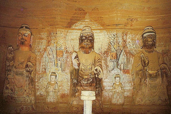 令人贊嘆的是那些高大的佛像。165窟內(nèi)正壁和左右壁雕鑿八米高的七尊立佛。這七尊佛像面相方圓,嘴唇厚重,兩耳垂肩,體魄雄健,帶著北方少數(shù)民族氣質(zhì)特徵。而在前壁兩邊雕鑿有五.八米高的兩身交腳菩薩;同時佛與佛之間還雕鑿有四米高的脅侍菩薩十身;窟門內(nèi)南北兩側(cè)雕鑿有三.○五米高的乘象菩薩和三.一米高的三頭四臂阿修羅天造像,所有的造像無不表現(xiàn)出北魏時期的北方少數(shù)民族特色。