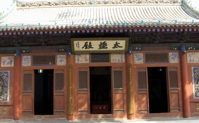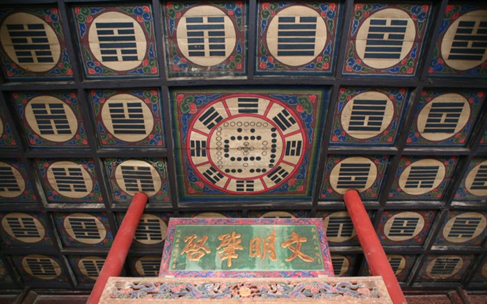 先天殿在中院月臺(tái)的當(dāng)間部位。此殿異常宏大壯觀??粗岣吡杩?、莊重威嚴(yán)的風(fēng)格,游人往往嘖嘖贊嘆。這座大殿通高二十六點(diǎn)七米,縱深十三點(diǎn)五米,面寬七間,通長(zhǎng)二十六點(diǎn)四米,是一座典型的明代風(fēng)格建筑。殿頂上覆琉璃簡(jiǎn)瓦,正脊兩端亦施龍吻,垂脊、戧脊 施螭獸仙人。正脊中有橋亭火珠,脊面乃飾纏枝牡丹。其奇巧精致,耐人尋味。這座宮殿的門(mén)窗雕飾工藝,堪為上選藝術(shù)品,往往吸引不少游人,版權(quán)所有山東聊城聊之旅國(guó)際旅行社有限公司,轉(zhuǎn)載必究!由于為其精美的工藝所傾倒,而總是流連忘返。這些門(mén)窗,全系木質(zhì)結(jié)構(gòu),上面鏤刻雕飾有金錢(qián)、艾葉、仙鶴、孔雀、蝙蝠、蝴蝶,還有二龍戲珠、鹿宿松下等圖案,花紋細(xì)密,栩栩如生,有很高的欣賞價(jià)值。入大殿內(nèi),即見(jiàn)一中心方柱似的神龕,這便是供奉伏羲塑像的地方。完高五米有余,上根懸掛"文明肇啟"匾額,系清代嘉慶年間秦州牧王賜均所書(shū)。匾文是對(duì)伏羲始創(chuàng)八卦、教民克愚的巨大功績(jī)的高度贊頌。