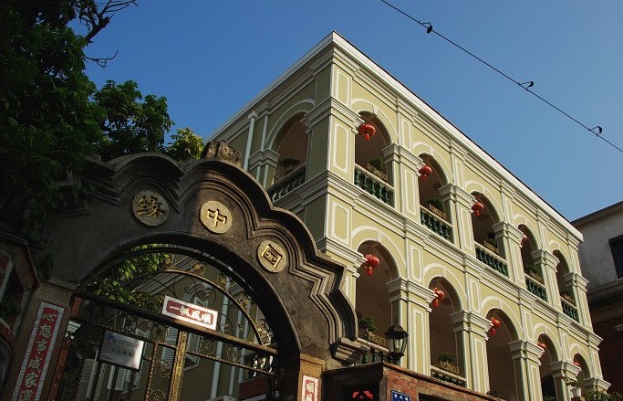 中樓是一幢仿古大屋頂宮殿式建筑,采用重檐歇山頂,四角高高翹起,門、窗、廊、廳的楣上均掛水泥透雕掛落飛罩,檐角均飾纏枝花卉或吸水蛟龍?zhí)袅喝柑婢荦堷P飾件。特別是屋頂下裝飾二個藻井,井壁上繪中國花鳥畫,外形又頗像亭子,非常突出。走廊外沿裝飾斗拱掛落,花籃垂柱,把中樓裝點得十分民族化。遠遠望去,這幢建筑頗有氣勢,又穩(wěn)重脫俗。