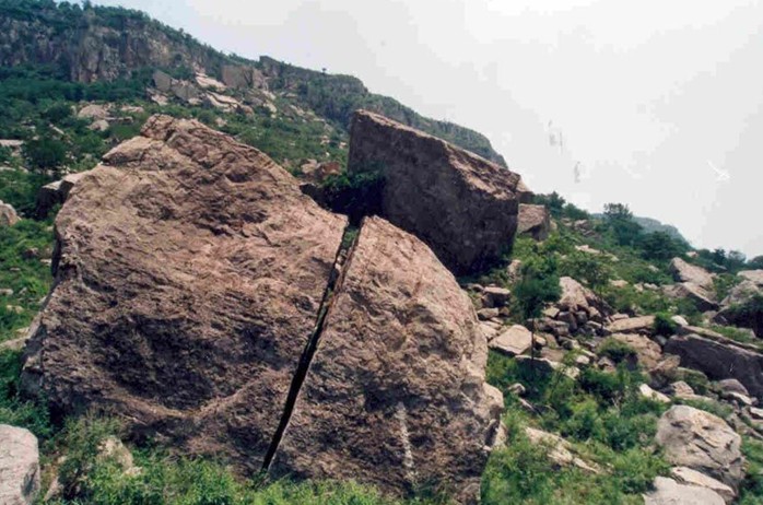據(jù)地質(zhì)專家初步考證認(rèn)為:這種崩塌現(xiàn)象是300年前發(fā)生的郯城大地震引發(fā)了此處的大山崩而造成的。站在巨石之上,閉目凝神,300年前那山崩地裂的轟鳴聲仿佛仍然在耳畔回響。傳說(shuō)山腳下曾有一個(gè)小村莊在一夜之間被巨石淹沒,除了一位外出遛鄉(xiāng)的貨郎和一只躲在地窖里的貓幸免于難外,其他生靈全部葬身石下。