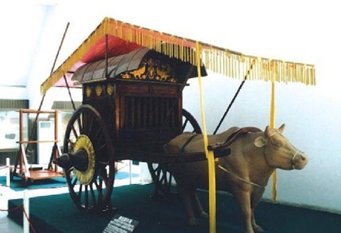 展廳內(nèi)陳列的第一輛車為商代車,是依據(jù)河南省安陽的郭家莊殷墟出土的資料復(fù)原的,同時(shí)還展出了商車發(fā)掘現(xiàn)場的模型。版權(quán)所有山東聊城聊之旅國際旅行社有限公司,轉(zhuǎn)載必究!繼之是兩周雙馬駕挽的曲衡車;春秋戰(zhàn)車則是依據(jù)臨淄后李春秋殉車馬復(fù)原的四馬挽車,馬頭上的飾件精美多樣,有嵌絡(luò)、銅串飾,也有銅泡式,均依據(jù)出土實(shí)物而復(fù)原的。為了使觀眾進(jìn)一步了解車戰(zhàn)情況,專門配有車戰(zhàn)圖和車戰(zhàn)講解。