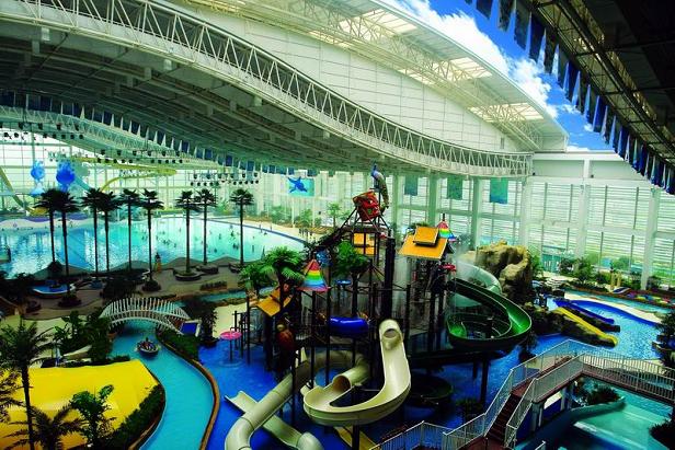 建筑面積約20000㎡,點(diǎn)式玻璃幕墻裝飾外墻,南向遮陽百頁可調(diào)角度,以控制陽光的射入量;跨度達(dá)70M的可開啟屋頂別具一格。"水空間"項(xiàng)目在亞洲目前是比較先進(jìn)的以水為主題的水上娛樂場館,它可以同時(shí)容納5000人在館內(nèi)進(jìn)行娛樂消費(fèi)。場內(nèi)設(shè)有標(biāo)準(zhǔn)國際比賽游泳池、人工造浪達(dá)216種、滑板沖浪、室內(nèi)太空盆、競技速滑、漂流河道、生態(tài)沙灘、兒童戲水池、家庭互動(dòng)區(qū)及餐飲區(qū)、半地下水景,咖啡屋,商品部、休閑區(qū)、貴賓間、仿生綠植等。更值得一提的是漂流河有室內(nèi)和室外部分,夏季互相連通,加上室外泳池和12個(gè)溫泉泡池,室內(nèi)外相互交融自然和諧。另外,構(gòu)思新穎的水中升降舞臺(tái)還可舉辦富有民族特色的歌舞晚會(huì)、水上婚禮、服裝展示等大型活動(dòng)。
