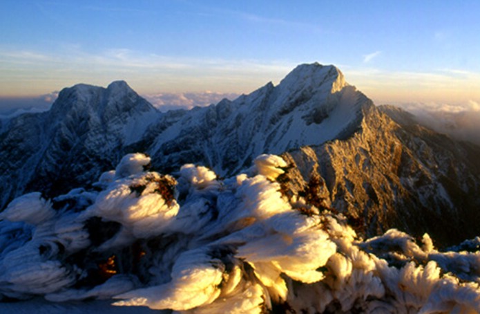 主峰玉山海拔3997米,為臺灣第一高峰。因常年積雪,遠(yuǎn)望如玉,南、西、北四座高峰,人稱“五岳朝天”。玉山之美,美在它的奇峰。主峰挺拔、高峻,山容山勢具王者之尊。站在山巔向四周眺望;北面雪山、南湖大山、中央尖山;南面關(guān)山、北大武山,遍覽無遺;清晰可數(shù)。真有“會當(dāng)凌絕頂,一覽眾山小”之感,俯視全省,群山如丘,河溪如帶;遠(yuǎn)望太平洋,回顧臺灣海峽,只見無窮蔚藍(lán)空碧,仿佛天地相接,直覺浩氣充溢心胸。