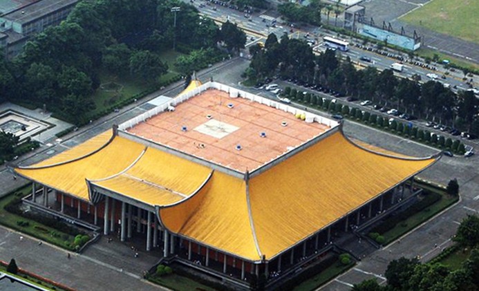 紀(jì)念館高30.4公尺,每邊長100公尺,由每邊14支灰色大柱,頂起翹角像大鵬展翼的黃色大屋頂,安靜地坐落在十萬公尺見方的平地中央,四周叢林、花草、廣場圍繞,突顯建筑物和環(huán)境的對比,引人注目,給人第一個(gè)感覺是宏偉,很有氣勢。巍峨莊嚴(yán)的建筑本體,粗獷剛強(qiáng),樸素中又不失應(yīng)有的細(xì)致,所以國父紀(jì)念館外觀宏偉、高雄、簡潔、明爽、有力,不但使人產(chǎn)生景仰,也令人感到力與美的結(jié)合。