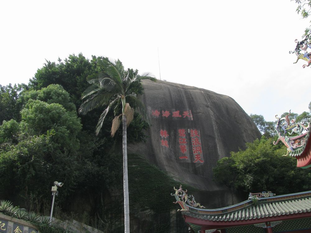 站在日光巖山門處,看到一塊高40多米的巨巖,凌空而立,在那巨巖峭壁上,有1915年許世英題刻的“天風海濤”四字橫書;其下還有兩行大字題刻,右側(cè)為“鼓浪洞天”,左側(cè)為“鷺江第一”,前者系明萬歷元年(公元1573年)江蘇丹陽人丁一中所書,這是日光巖最早的題刻。后者是清道光年間福建長樂人林钅咸所寫,兩者靠近,字跡相當,林钅咸署名特別大,游人常誤為二者皆是林钅咸所題,其實后者比前者晚刻二百多年。上述三大崖刻,可說是對日光巖的風光作了形象性的概括,給游人留下深刻的印象。這就是日光巖的第一景。