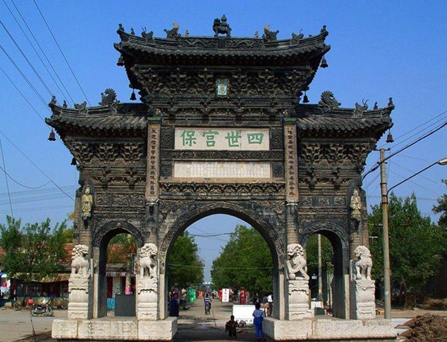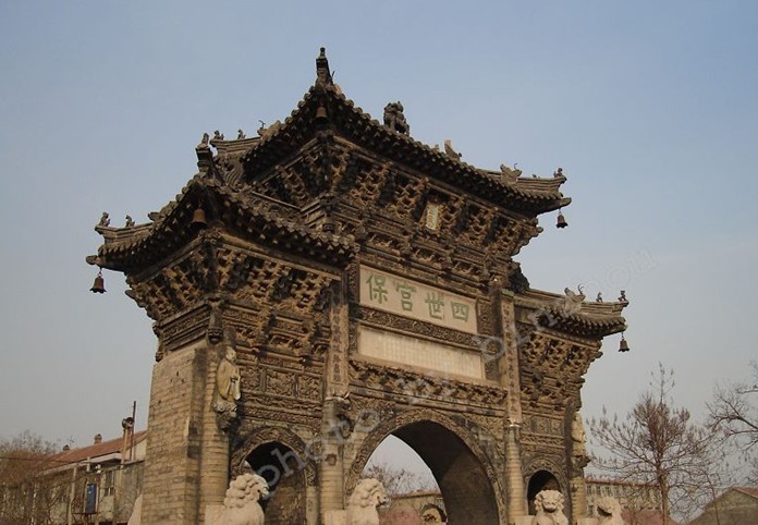 四世宮保坊位于山東省淄博市,建于1619年(明萬歷四十七年),系磚石結(jié)構(gòu),呈中間高左右低的宮殿式。面闊9.2米,進深3.33米,高15米,拱門洞兩側(cè)有石獅8個。拱門、楹柱等上面雕有飛禽走獸、山水花卉,特別是磚砌圓柱頂部的4個浮雕人物,栩栩如生,顯示了明代雕刻家的精湛技藝。