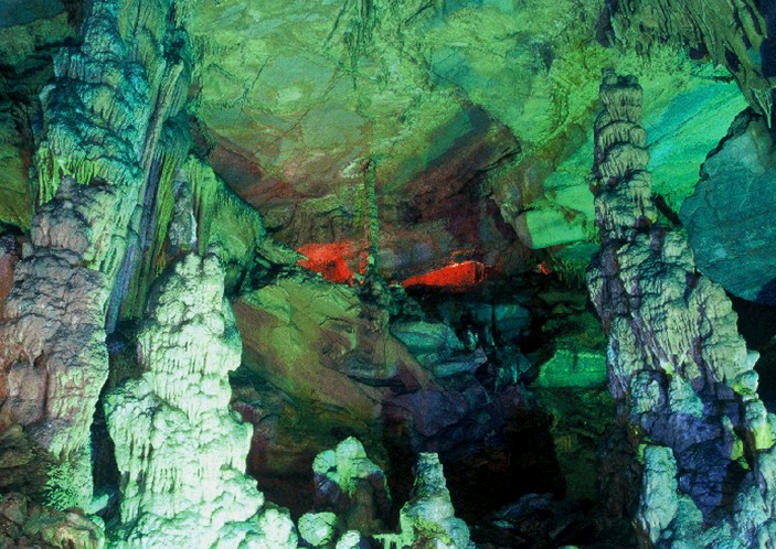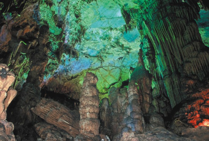 “石龍洞”以洞內(nèi)天然石龍而得名,全長218米,景點43個,主要景觀有“雙龜把門”“龍王宮”“銀河相會”“龍蛇相斗”“長壽湖”等。