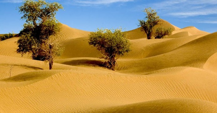 位于中國新疆的塔里木盆地中央,是中國最大的沙漠,也是世界第二大沙漠,同時還是是世界最大的流動性沙漠。整個沙漠東西長約1000公里,南北寬約400公里,面積達(dá)33萬平方公里。平均年降水不超過100毫米,最低只有四五毫米;而平均蒸發(fā)量高達(dá)2500—3400毫米。這里,金字塔形的沙丘屹立于平原以上300米??耧L(fēng)能將沙墻吹起,高度可達(dá)其3倍。沙漠里沙丘綿延,受風(fēng)的影響,沙丘時常移動。沙漠里亦有少量的植物,其根系異常發(fā)達(dá),超過地上部分的幾十倍乃至上百倍,以便汲取地下的水份;那里的動物有夏眠的現(xiàn)象。