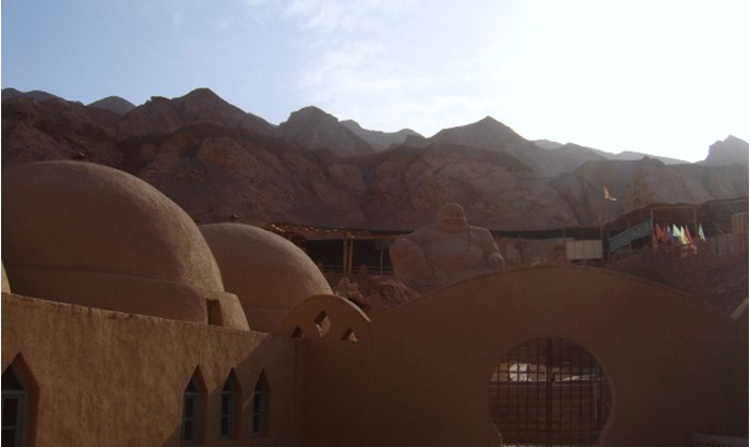 唐僧取經(jīng)群塑形態(tài)生動,表情逼真。群塑是1989年修造的。來此觀瞻照相的中外游人接連不斷,是火焰山新辟的旅游景點之一。遺憾的是群塑人為的被高高的鐵柵欄團團圍住,形同囚犯,令游人駐足長嘆。