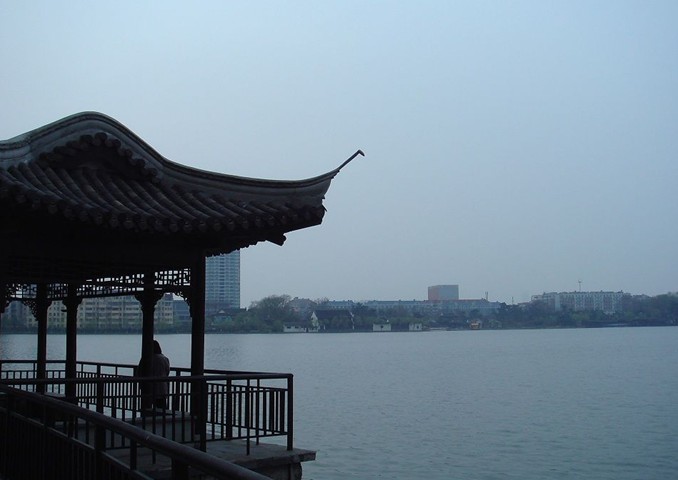 待渡亭居光華亭西側(cè),1959年建,古典建筑形式,磚木結(jié)構(gòu),建筑面積38.08平方米。設(shè)渡湖心亭游船碼頭。待渡亭附建走廊面積54.6平方米,混合結(jié)構(gòu)。至老后門(mén)沿湖畔有長(zhǎng)500米、寬2米道板路。