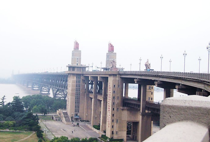 南京長江大橋,位于南京市西北面長江上,連通市區(qū)與浦口區(qū),是長江上第一座由我國自行設(shè)計(jì)建造的雙層式鐵路、公路兩用橋梁。上層的公路橋長4589米,車行道寬15米,可容4輛大型汽車并行,兩側(cè)還各有2米多寬的人行道;下層的鐵路橋長6772米,寬14米,鋪有雙軌,兩列火車可同時(shí)對開。其中江面上的正橋長1577米,其余為引橋,是我國橋梁之最。正橋的路欄上,公路引橋采用富有中國特色的雙孔雙曲拱橋形式。公路正橋兩邊的欄桿上嵌著200幅鑄鐵浮雕,人行道旁還有150對白玉蘭花形的路燈。