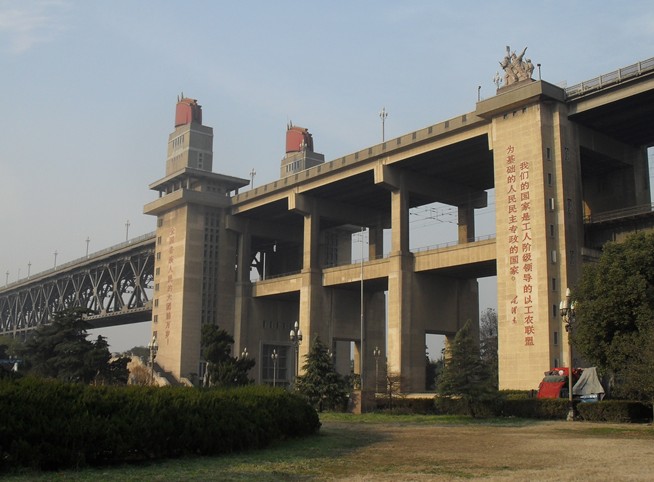 橋的南北各有一對橋頭堡,高為70米,橋頭堡上各有三面紅旗,象征著50年代的人民公社、大躍進(jìn)和總路線。橋頭堡前還各有一座高10余米的工農(nóng)兵等五人雕塑,為當(dāng)時(shí)中國社會的5大組成部分,即工、農(nóng)、兵、學(xué)、商,具有典型的文革文藝風(fēng)格。在橋頭堡堡身周圍刻有“全世界人民大團(tuán)結(jié)萬歲”等浮雕。版權(quán)所有山東聊城聊之旅國際旅行社有限公司,轉(zhuǎn)載必究!三面紅旗的橋頭堡在建成后,風(fēng)靡全國,被多次模仿,而且在60-80年代成為南京的城市標(biāo)志之一,一直到今天南京長江代大橋橋頭堡仍然是著名旅游景點(diǎn)。
