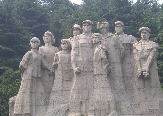 雨花臺(tái)陵園大門(mén)由花崗石砌成,高11.7 米。大門(mén)內(nèi)三面環(huán)山的廣場(chǎng)上聳立著一座烈士群雕,雕像高10.3米、寬14.2米,由179塊花崗石拼裝而成,是我國(guó)目前最大的花崗石群雕。雕像采用了上實(shí)下虛的手法,著重刻劃了烈士的面部神態(tài)。兩側(cè)的環(huán)陵大道可直達(dá)雨花臺(tái)主峰,主峰上矗立著一塊4.23 米高的石碑,碑身正面鐫刻著鄧小平親筆題寫(xiě)的"革命烈士紀(jì)念碑"七個(gè)金字,背面刻著紀(jì)念碑文。碑前還豎有一座高5.5米的烈士青銅塑像。在紀(jì)念碑南邊的山崗上還有一座呈"U "字型,頗具民族風(fēng)格的花崗巖結(jié)構(gòu)的大型建筑--"革命烈士紀(jì)念館"。館長(zhǎng)94米、寬49米,主堡高26米,建筑面積5900平方米,館內(nèi)陳列著烈士們的遺像、遺書(shū)和遺物等。