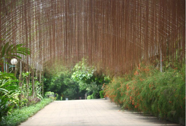 香草蘭試驗(yàn)示范基地是植物園里的第二個展區(qū)。香草蘭是一種名貴的熱帶香料植物, 素有“食品香料之王”的美譽(yù)。香草蘭是藤本植物,它們生長在科研人員搭好的架子上,構(gòu)成了一片綠蔭,架子下涼快通風(fēng),可見香草蘭跟人一樣,也喜歡涼快。