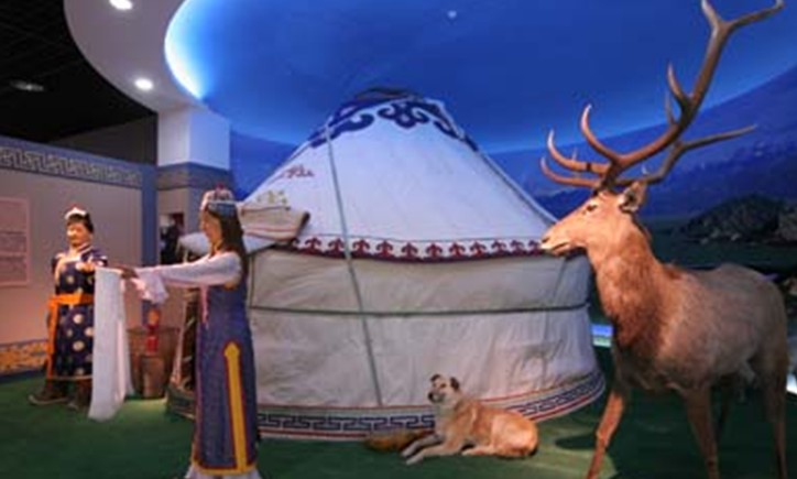 進(jìn)入此展廳的同時(shí)觀眾就會(huì)被新疆獨(dú)具特色的民居風(fēng)格和色彩絢爛的民族特色所吸引。在以維吾爾民居為主的中央主展廳,還配置了三個(gè)各具特色的哈薩克族,柯?tīng)柨俗巫逡约懊晒抛宓臍址浚鞣N動(dòng)物標(biāo)本,猶如進(jìn)入了一個(gè)遼闊的草原,時(shí)刻準(zhǔn)備與游牧民族高歌,與游牧民族同飲的感覺(jué)油然而生。