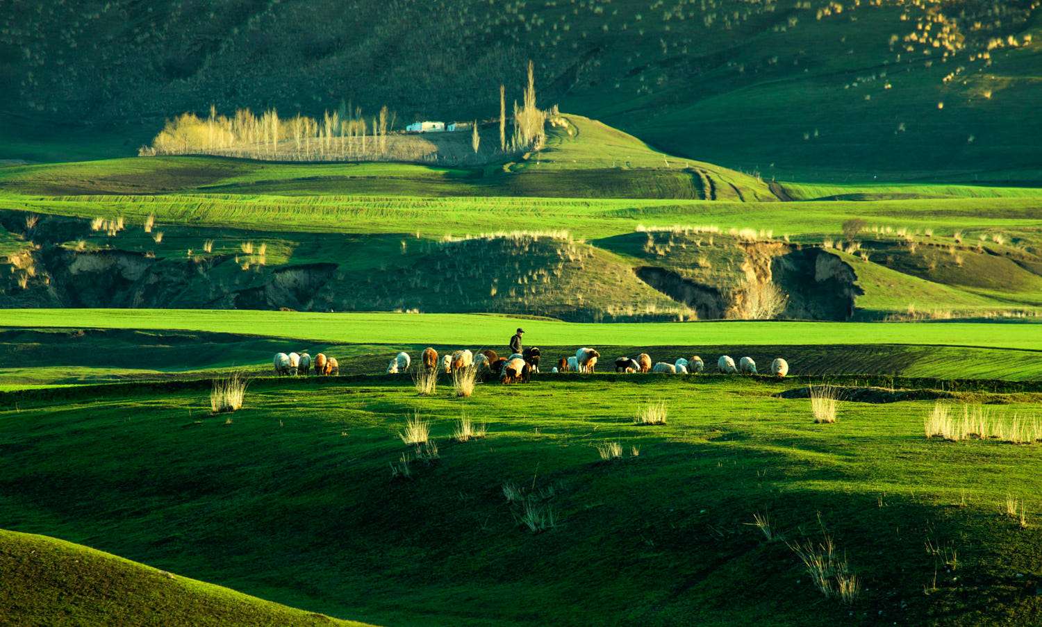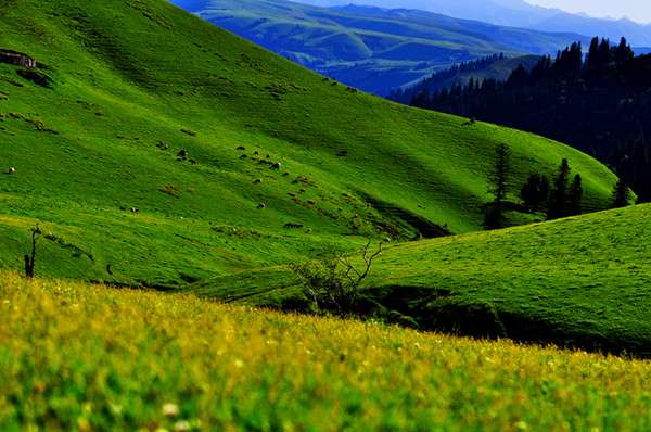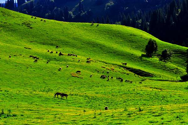 那拉提草原是發(fā)育在第3紀古洪積層上的中山地草場,東南接那拉提高嶺,勢如屏障,西北沿鞏乃斯河上游谷地斷落,地勢大面積傾斜,山泉密布,溪流縱橫。版權所有山東聊城聊之旅國際旅行社有限公司,轉載必究!緣山腳沖溝深切,河道交錯,森林茂密,莽原展緩起伏,松塔沿溝擎柱,還有氈房點點,畜群云移,是鞏乃斯草原的重要夏牧場。