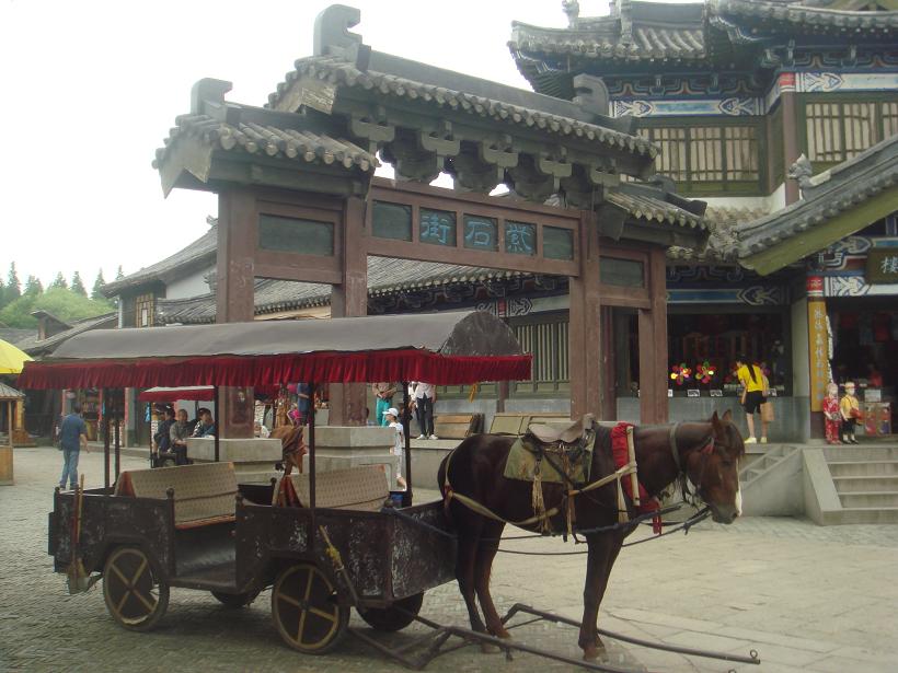 城門樓大道右側(cè),駐扎著數(shù)十頂軍帳,“桃園”內(nèi)桃花盛開,一曲英雄淚飛的結(jié)義曲響起,“劉關(guān)張”正飲酒立誓,祭告天地。桃園后山坡上,一組三國(guó)人物兵馬群雕栩栩如生,形神兼?zhèn)?,再現(xiàn)名著、傳說中的歷史人物形象。左側(cè)的跑馬場(chǎng)上,參加《三國(guó)演義》實(shí)拍的影視馬術(shù)特技隊(duì)每天都為游客真槍實(shí)刀地表演“三英戰(zhàn)呂布”,場(chǎng)面宏大,驚心動(dòng)魄,四十多匹駿馬也都是訓(xùn)練有素的戰(zhàn)馬,游客還可以披上戎裝,體會(huì)一下亂世英雄躍馬揚(yáng)鞭、指點(diǎn)江山的豪邁氣概。