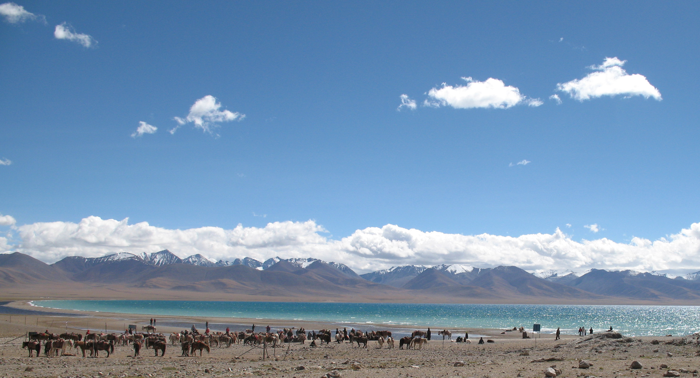 途中休息2次。10:00,在海拔4630米的念青唐古拉山觀景臺(tái)休息一會(huì),車停在公路邊。 11:30,在那根拉山口休息。這里海拔5190米,是拉薩到納木措的最高點(diǎn)。但要特別注意,這里有一些當(dāng)?shù)厝藸恐笈J召M(fèi)照相,非常惡劣!不給錢就擋住那根拉的石碑,不讓人照相?;蛘呷浩鸸粲慰?。游客在這里停留的時(shí)間有限,根本沒(méi)辦法和他們耗。最好不要和他們糾纏,能照就趕快照相。如果發(fā)生沖突,荒山野嶺,不好收拾。納木措也有一些牽馬或牦牛收費(fèi)照相的。