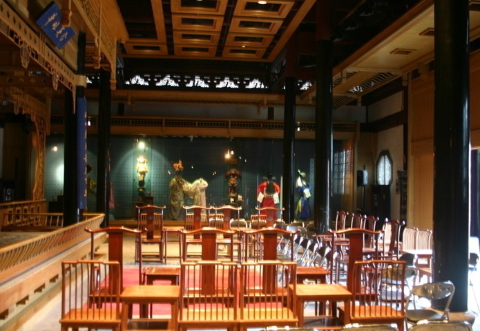 古戲臺是觀看古戲臺演出的最佳地方。兩廂墻上掛有昆曲文木雕、磚雕等,既是陳列,又是裝飾,兩廂用竹廉隔成開放式包廂,觀眾與游客既在此觀看昆曲表演,亦可休閑品茶。