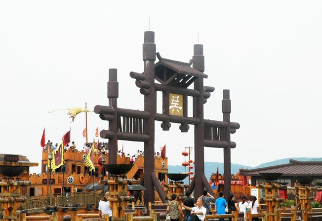 大道前方,豎立著三座高大的轅門,這就是曹營(yíng)水旱寨了。它由曹操點(diǎn)將臺(tái)、轅門、四座敵樓和樓船組成,是《三國(guó)演義》中“火燒赤壁”、“橫槊賦詩(shī)”、“草船借箭”等戲的拍攝所在。曹操點(diǎn)將臺(tái)兩側(cè),戰(zhàn)鼓矗立,版權(quán)所有山東聊城聊之旅國(guó)際旅行社有限公司,轉(zhuǎn)載必究!依稀可見(jiàn)一代梟雄曹公當(dāng)年的威儀。站在三層高的點(diǎn)將臺(tái)上,極目遠(yuǎn)眺,水寨風(fēng)光盡收眼底。陸地上的樓臺(tái)堂榭與湖上的望江敵樓相峙對(duì)望,讓人驚嘆設(shè)計(jì)者的獨(dú)具匠心和建造者的巧奪天工。整個(gè)曹營(yíng)還是“火燒赤壁”這場(chǎng)戲的拍攝地。據(jù)統(tǒng)計(jì),在拍攝“火燒赤壁”這場(chǎng)戲時(shí),就動(dòng)用了九臺(tái)攝像機(jī)、一架直升機(jī),從空中、陸地、水上同時(shí)進(jìn)行拍攝。剎時(shí),火光沖天,烈焰翻騰,東西綿延500米的曹營(yíng)成為一片火海。曹營(yíng)內(nèi),古樸雄偉的大轅門連接一條80米長(zhǎng)、6米寬的甬道直通曹操樓船,三層高的樓船固定于湖面,游人扶舷撫艙之際,遙想1700多年前曹公躊躕滿志、橫槊賦詩(shī)的慷慨之情,頓生“是非成敗轉(zhuǎn)頭空”的滄桑之感。