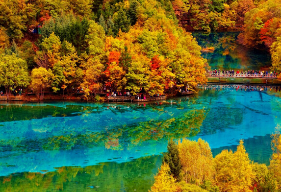 因溝內(nèi)分布著9個(gè)藏族村寨而得名,海拔2000~3000米,屬高山深谷碳酸鹽堰塞地貌,以翠海(高山湖泊)、疊海、彩林、雪山、藏情“五絕”馳名中外,被譽(yù)為“夢仙境”和“童話世界”。主景長沙有六公里,面積6萬多公頃,有長海、劍巖、諾日朗、樹正、扎如、黑海六大景觀,呈“Y”字形分布,以水景最為奇麗,泉、瀑、河、灘將108個(gè)海子連綴一體,碧藍(lán)澄澈,千顏萬色,多姿多彩,“水在樹間流,樹在水中長”,有“黃山歸來不看岳,九寨歸來不看水”和“世界水景之王”之稱。