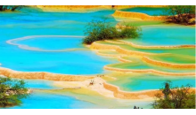 九寨溝是白水溝上游白河的支溝,以有九個(gè)藏族村寨(所以又稱何藥九寨)而得名。黃龍風(fēng)景區(qū)位于四川省阿壩藏族羌族自治州松潘縣境內(nèi),由黃龍本部和牟尼溝兩部分組成。主景區(qū)黃龍溝位于岷山主峰雪寶頂下,以彩池、雪山、峽谷、森林“四絕”著稱于世,是中國唯一的保護(hù)完好的高原濕地。“人間仙境”、“童話世界”是形容九寨與黃龍最合適詞匯?!熬耪瘹w來不看水”,水是九寨溝的精靈,湖、泉、瀑、灘連綴一體,飛動(dòng)與靜謐結(jié)合,剛烈與溫柔相濟(jì)。 “人間瑤池”黃龍溝位于松潘縣東約35千米處,是玉翠山中一條南北向的溝谷,長約7.5公里。與九寨溝一山之隔,但因雪山阻隔,需經(jīng)公路繞行100公里方可到達(dá)。這條溝的奇妙之處是溝底的巖石,晶瑩光滑,類似石灰?guī)r溶洞中的鐘乳石,巖石跌宕起伏,順著山溝,曲折蜿蜒,猶如一條黃龍盤旋而上。黃龍奇異的景色,使它擁有“黃龍?zhí)煜陆^”的美稱。