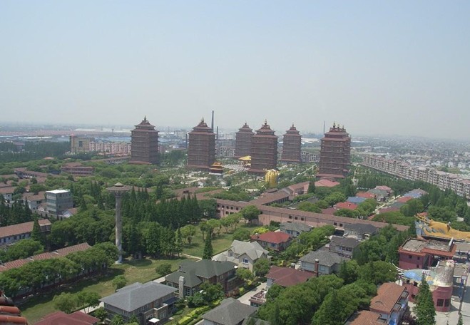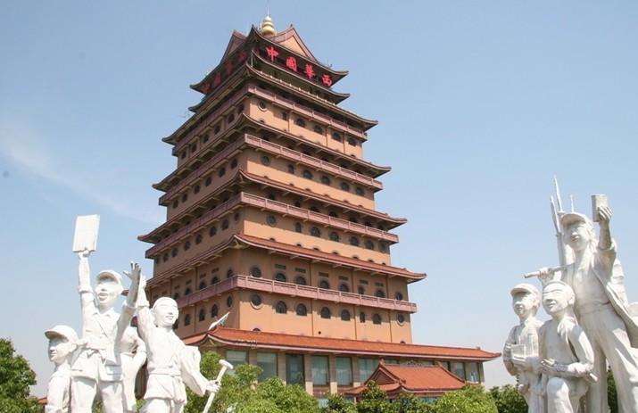 走進(jìn)華西村,遠(yuǎn)遠(yuǎn)就能看見(jiàn)由9座高樓組成的建筑群,是塔不像塔,說(shuō)樓不是樓。它比普通的塔要高大得多,比普通的樓頂要尖,頂端還豎立著金色的葫蘆。準(zhǔn)確地說(shuō),這些樓叫做“塔形樓”或者“塔狀樓”。塔群里每座樓都有獨(dú)特的功能設(shè)計(jì),有的是集團(tuán)辦公樓,有的是賓館、培訓(xùn)中心、營(yíng)養(yǎng)配餐中心。