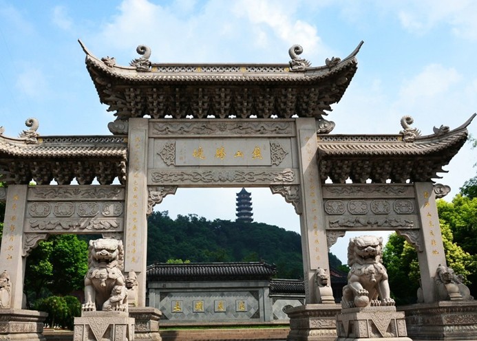 從長江邊上與焦山對峙的象山腳下的渡口擺渡過江,不到五分鐘就可踏上綠色的小島—焦山。迎面的焦山大門,朱漆彩畫,一對石獅鎮(zhèn)守大門。門旁左右懸掛著清代光緒年間巴州廖倫所寫的一幅楹聯(lián)“長江此天塹,中國有圣人”,顯得古樸典雅。進入山門,迎壁就是對聯(lián)的橫披“海不揚波”四個大字,為明代書法家胡纘宗所書,意為焦山矗立江心,猶如鎮(zhèn)海之石,驅(qū)逐水妖,故而海不揚波。在佛教上“海不揚波”是清平世界的意思。