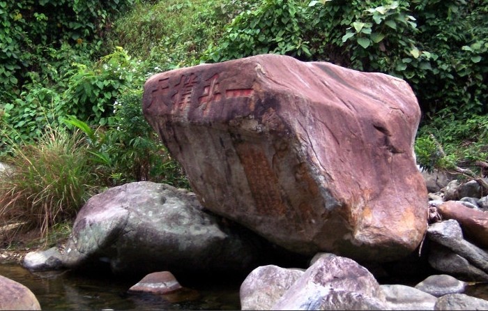 位于海南瓊中縣上安鄉(xiāng)仕階村,在五指山與湯匙嶺之間的東邊大巖石上,距五指山僅5公里,距上安鄉(xiāng)13公里,離縣城營根39公里。一片清代光緒十三年春砌志,是清朝將領(lǐng)馮子才及幕僚刻石,其中,“手辟南荒”、“一手撐天”、“百越鎖鑰”、“巨手擎天”等摩崖石刻群。字大如斗,筆法渾厚,氣勢磅礴。明代大學(xué)士邱浚的詠五指山詩曰“五峰如指翠相連,撐起炎荒半壁天。夜盥銀河摘星斗,朝探碧落弄云煙。雨余玉筍空中現(xiàn),月出明珠掌上懸。豈是巨靈伸一臂,遙從海外數(shù)中原”。
