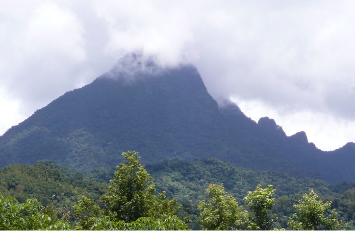 近看五指山,只見5個“指頭”由西南向東北,先疏而后密地排列。跟前那座郁郁蔥蔥的山峰,便是五指山第一峰,海拔1300多米,崢嶸壁立,那頂峰傾斜指著天際。在五指山區(qū)公所的所在地朝山上看,整座山峰好像一座碩大的金字塔,那山巔則像喙食尖削的鳥嘴,但是登上去后,卻是一大塊近10多平方米面積的巖石。