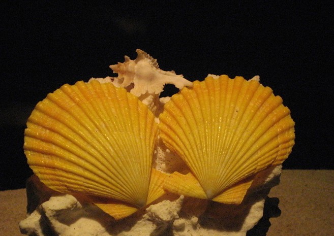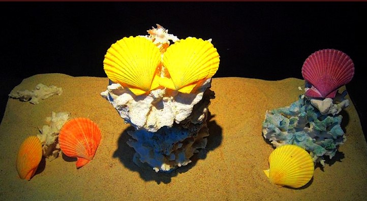 走進(jìn)貝殼展廳,仿佛走進(jìn)夢幻般的海底世界。曲徑通幽的貝殼展廳以藍(lán)色為設(shè)計(jì)主調(diào),四壁墻面除陳列貝殼展品用的櫥窗外均漫畫式的畫滿各種海藻、水草和海洋生物。地面墻角用鵝卵石和沙子堆積,然后用珊瑚、貝殼、海星、海龜?shù)葮?biāo)本點(diǎn)綴,營造出一種神奇的海底景觀。展廳四周的櫥窗內(nèi)陳列了300多種來自世界海洋最具代表性的貝殼,有展翅欲飛的“天使之翼海鷗蛤”、潔白如玉的“白鉛螺”、金光燦燦的“黃金寶貝”、色彩絢麗的“澳洲海扇蛤” 、形似眼睛的“貓眼蠑螺”、還有著名的活化石“紅翁絨螺”和“鸚鵡螺”…… ,這些形形色色、千姿百態(tài)的貝殼在燈光的映襯下就是一件件來自海洋深處的藝術(shù)珍品,讓游人在觀賞之后不僅驚嘆大自然鬼斧神工,同時(shí)激發(fā)他們熱愛大自然、保護(hù)海洋的情感。