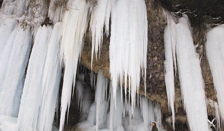 宋洛鄉(xiāng)里有一處冰洞,只要洞外自然溫度在28℃以上時(shí),洞內(nèi)就開始結(jié)冰,山縫里的水沿洞壁滲出形成晶瑩的冰簾,向下延伸可達(dá)10余米,滴在洞底的水則結(jié)成冰柱,形態(tài)多樣,頂端一般呈蘑菇狀,而且為空心。進(jìn)入深秋時(shí)節(jié),冰就開始融化,到了冬季,洞內(nèi)溫度就要高于洞外溫度。