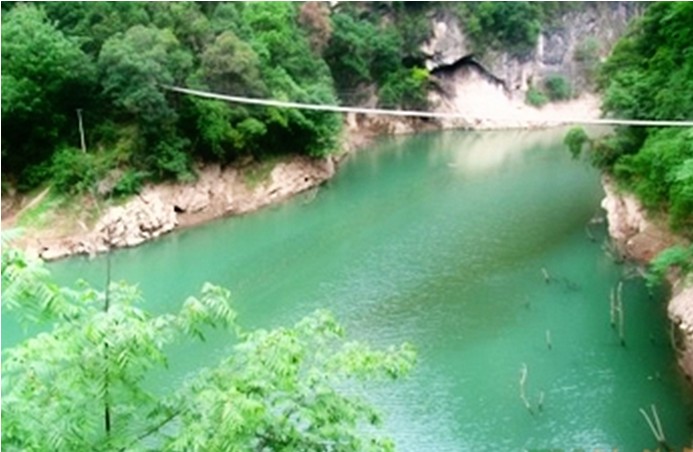 距松柏鎮(zhèn)24公里,該湖位于海拔500米的高山上,水深30米,長(zhǎng)12公里,是一個(gè)水庫(kù)。湖口有一個(gè)高54米、寬百余丈的瀑布,還有一道鐵索甩橋,橋面晃動(dòng)得十分厲害,要走過去是需要勇氣的。在湖邊的山壁上還有兩股溫泉,現(xiàn)已修建了溫泉池,可供游人沐浴。