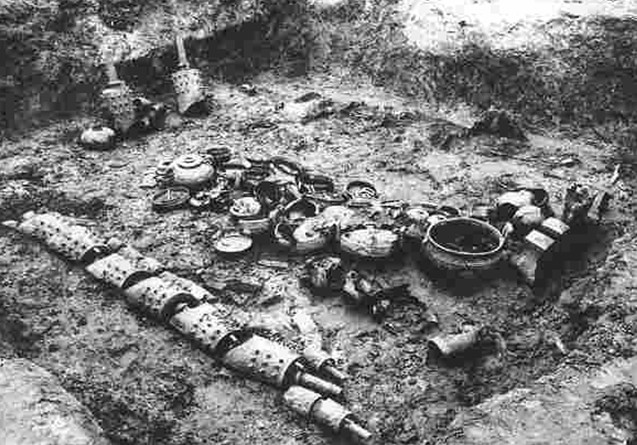 在距曾侯乙墓約500米的地方, 又發(fā)現(xiàn)了戰(zhàn)國時期的古墓群,初步查明為24座,出土文物200余件,主要是銅器、仿銅陶禮器和兵器, 尤以青銅劍為最多。據(jù)考證,這座墓群很可能是當時的一個公族墓,即古文獻所說的“族墳墓”。