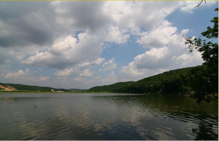 登上山頂,遠(yuǎn)望四野:腳下杏花山松林常翠;東面的石門山,綠樹蔥蔥;北部的半拉山,石光閃爍;西邊的長達(dá)山,薄霧升騰....。一條數(shù)百米長堤橫臥南北,和攬月門聯(lián)成一線,四面青山環(huán)抱一灣碧水,一葉輕舟搖碎湖光波影,確是一個令人舒心愜意的所在。